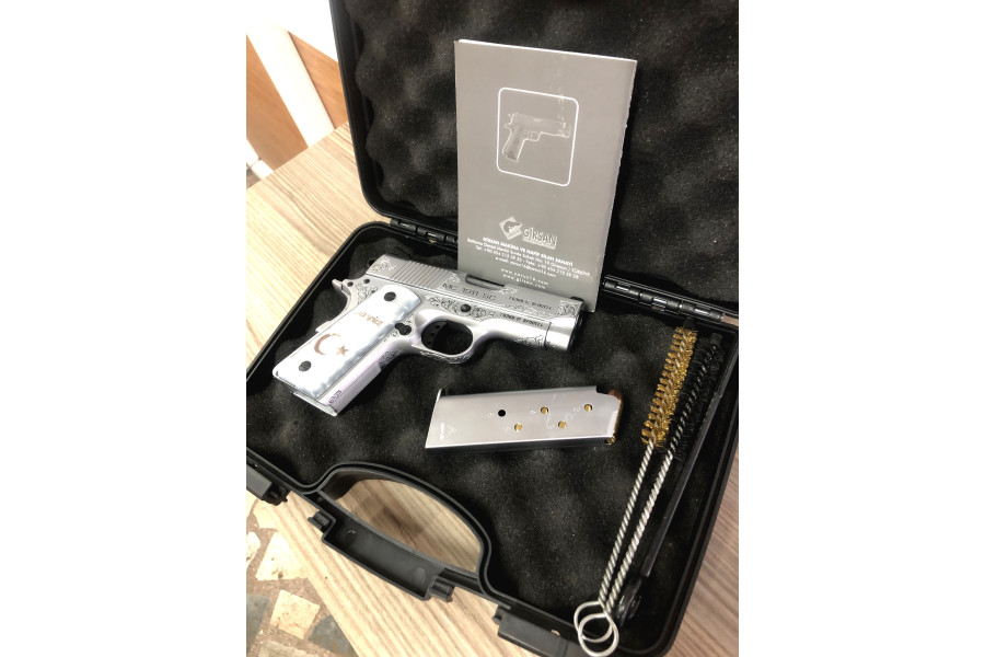 Girsan mc 1911 sc 45 acp modelidir Deneme amaçlı 150 mermi atılmıştır Üzerindeki işlemeler alındıgında Dursun Usta tarafından yapılmış olup silahın kendisinden daha pahalıdır 3 Adet yedek şarjör orjinal ahşap ceviz kabze kapakları ve 250 adet mermi (45 acp 3000 tl degerinde) beraberinde verilecektir Alındığından beri kasada muhafaza edilmiş bulundurma ruhsatlıdır Düzgün benzersiz bir silahtır Alıcısına hayırlı olması dilegiyle pazarlığa açıktır